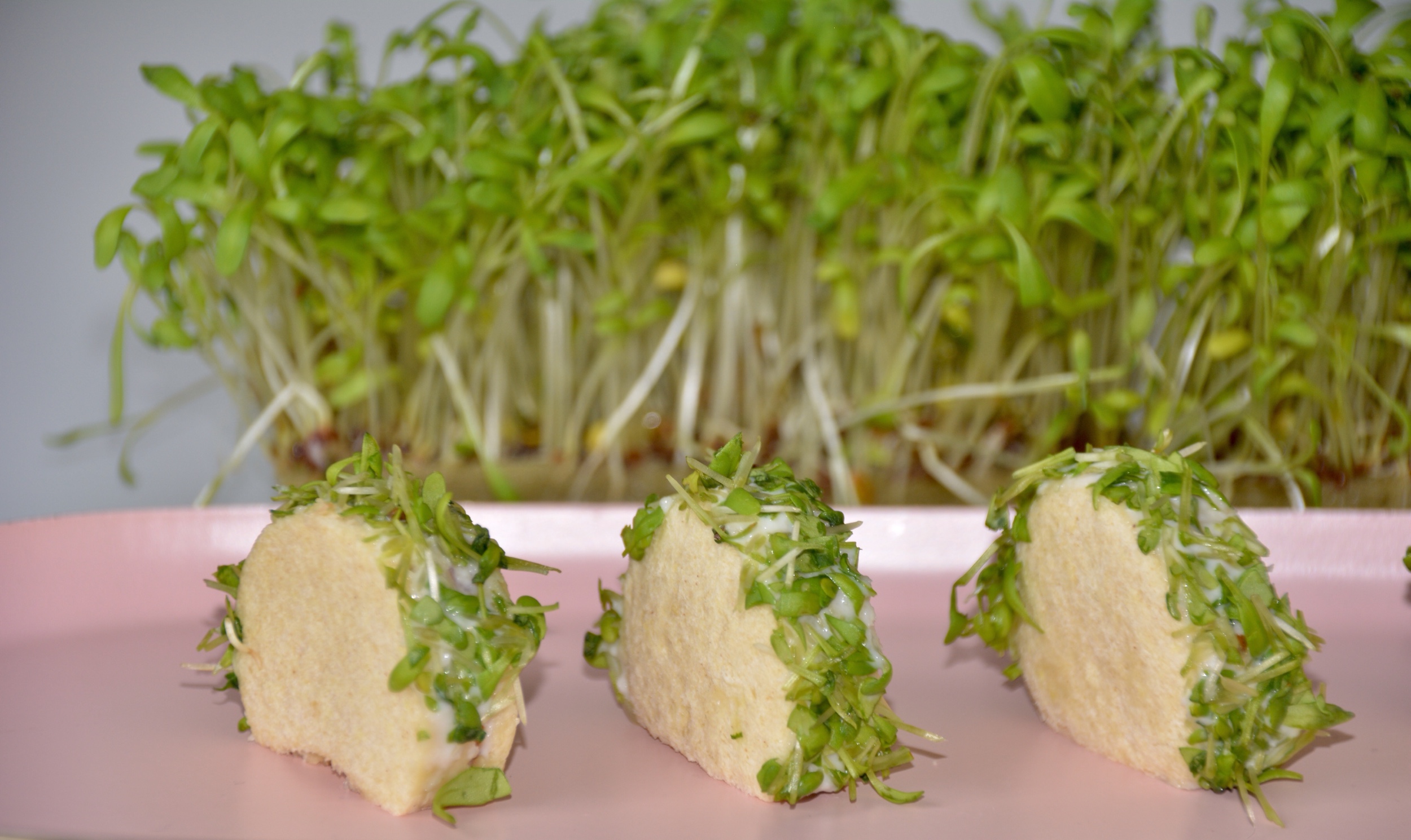 Die Kresse sollte man erst ganz zum Schluss hacken und um die Sandwiches machen, damit die gehackten Kräuter ihre Frische so wie ihre schöne grüne Farbe behalten.