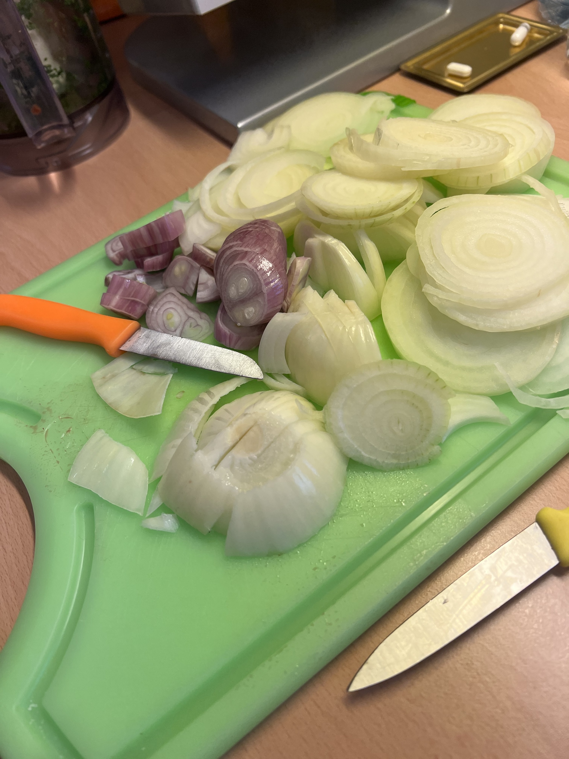1 grosse Zwiebel + 1 Schalotte, in grobe Stücke schneiden