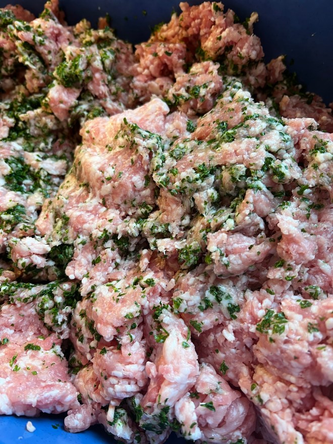 Den Schweinespeck habe ich mir beim Metzger schon fertig gemahlen bestellt. Diesen Arbeitsgang können sie sich zu Hause ersparen. Die Leber in grobe Stücke schneiden, und in einer heissen Pfanne mit etwas Olivenöl anbraten. Nur ganz kurz, eigentlich geht es darum, dass die Leber nicht mehr roh ist. Dadurch hat sie einen milderen Geschmack. Danach die Zwiebeln mit der Schalotte glasig anbraten. Die warmen Zutaten, Leber und Zwiebeln, etwas abkühlen lassen und durch die feine Scheibe des Fleischwolfes geben. Danach wird das ganze Fleisch zusammen in eine grosse Schüssel getan. Es kommen die fein gehackte Petersilie so wie 2 ganzen Eier dazu. Ebenfalls gibt man die Gewürze, so wie den Cognac dazu. Nun alles mit den Händen gut durchmischen. Nun geht’s ans abschmecken. Ich habe mir dafür einen Esslöffel von der Masse in einer kleinen Pfanne angebraten. So kann ich die Masse besser abschmecken, als wenn die Masse roh ist. Geben sie ruhig genug Muskatnuss dazu, das ergibt einen guten Geschmack.