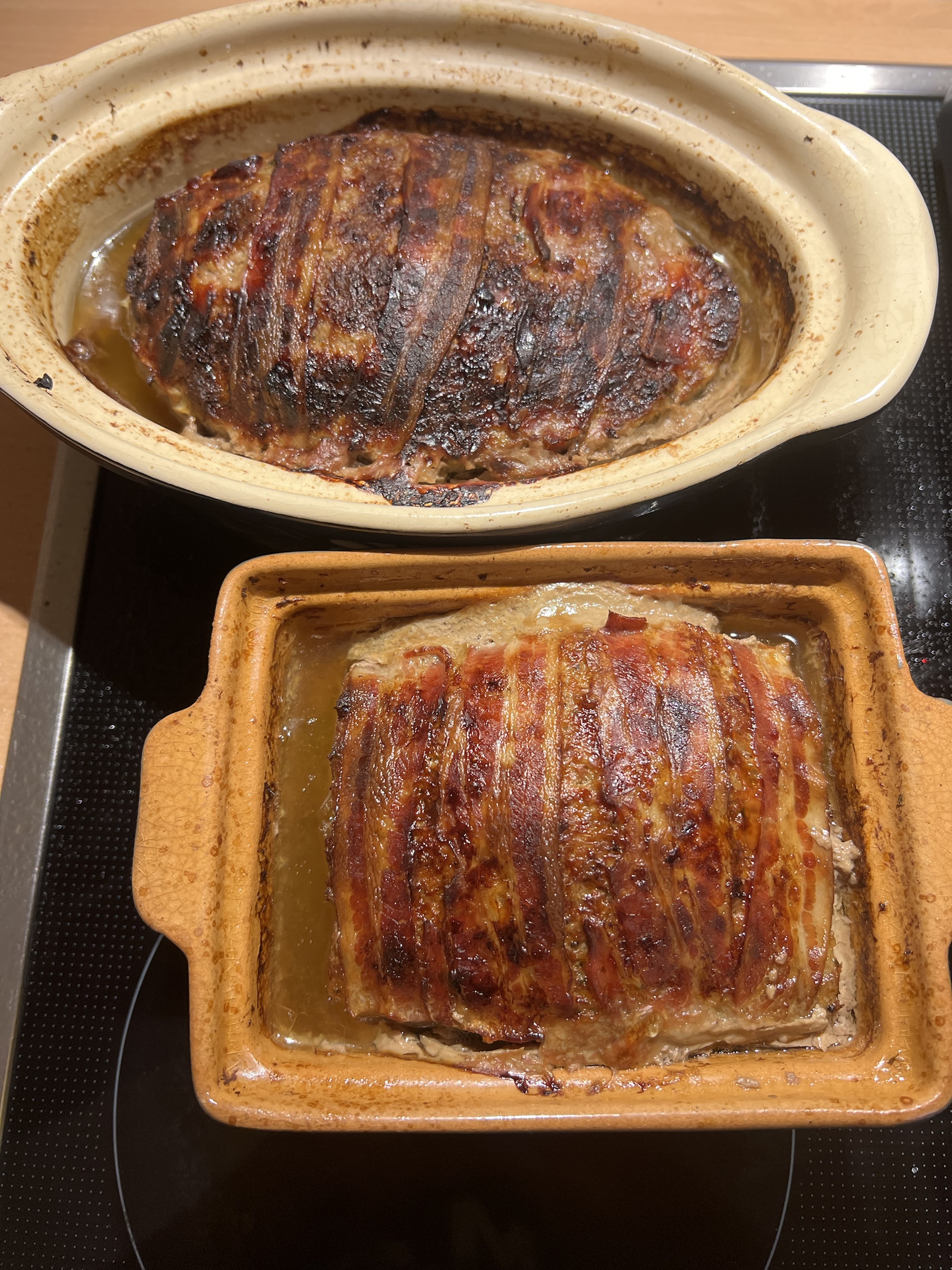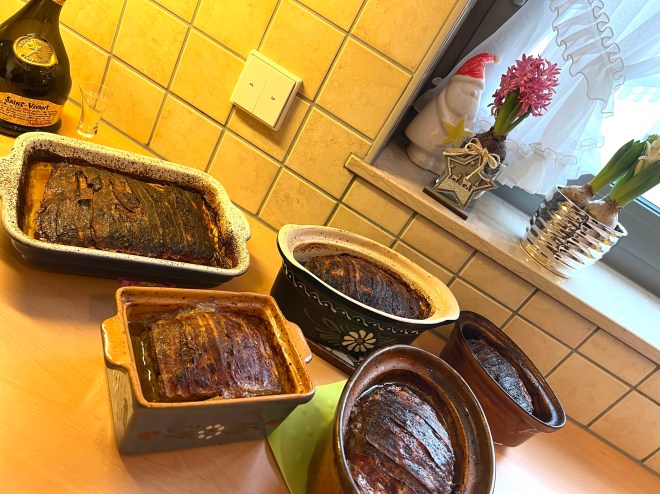 Jetzt kommt unser Fleischpâté in die dafür vorgesehenen Gefässe. Das können schöne Töpfe mit Deckel, z.b. aus dem Elsass sein oder eine Lieblingsschüssel oder aber auch ganz unromantisch stinknormale Aluschalen. Die Schüsseln werden mit geräucherten Speckscheiben, die dünn geschnitten sind ausgelegt. Die Masse wird auf die Schüsseln verteilt. (Bei uns waren es 5 Stück) Allerdings was ganz wichtig ist!! die Fleischmasse muss sehr kräftig in die Schüssel „gehauen“ werden. So als hätte man eine grosse Wut im Bauch, sagte meine Mutter mir. Wenn dem nicht so ist, hat man nach dem Backen „Löcher“ in der Fleischmasse, so als wäre diese gerissen und man kann keine schönen Scheiben schneiden, ohne dass sie brechen. Also nicht vergessen ! Für den Abschluss werden auch noch einmal obendrauf Speckscheiben gelegt um die Fleischpâté zu bedecken.