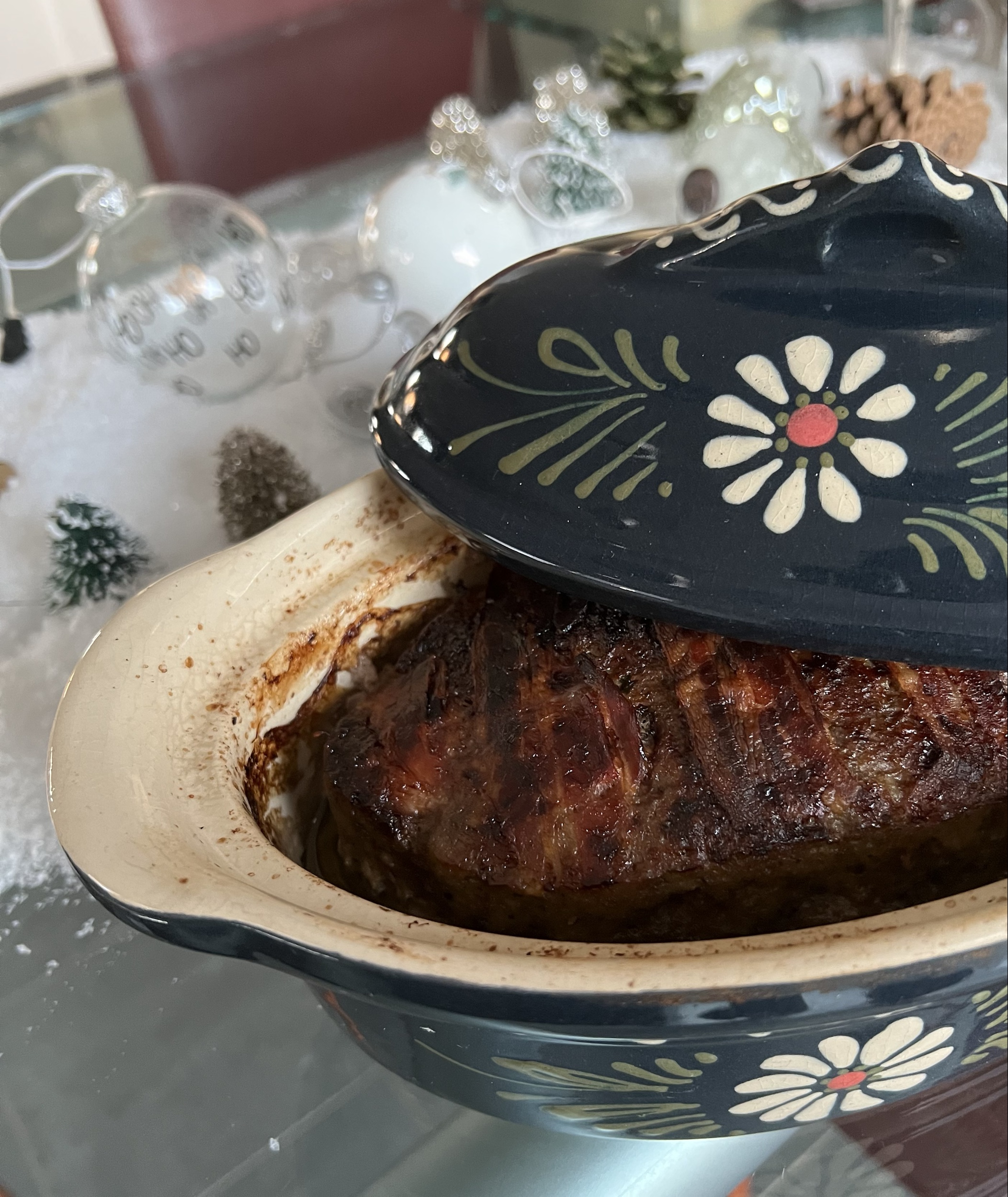 Die Fleischpâté für eine Stunde, mit Alufolie zugedeckt, in den Backofen geben. Nach einer Stunde die Alufolie entfernen und nochmals 10 Minuten auf 200 Grad im Backofen stehen lassen, bis unsere Fleischpâté an der Oberfläche etwas knusprig wird und Farbe annimmt.