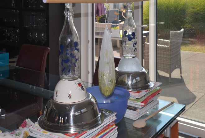 Für die Dashi, oder die Tomatenessenz, wie man sie auch nennen kann, werden die Tomaten zusammen mit der Misopaste, den frischen Kräutern und den Gewürzen zusammen in den Mixer gegeben. Einmal kräftig aufmixen. Danach kommt die Masse in ein Passiertuch, das man irgendwo aufhängt, damit die Flüssigkeit der Tomaten gut abtropfen kann und schön klar bleibt. Dieses Prozedere dauert einige Stunden.