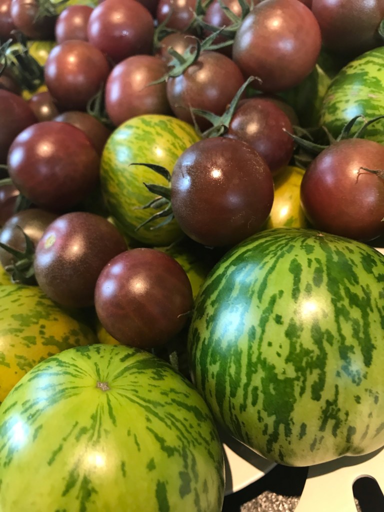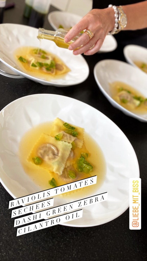 Wenn mich jemand fragen würde, was liebst du am meisten am Sommer, würde ich antworten die Tomaten, die guten wunderbaren alten Sorten an Tomaten, die man wieder aufleben liess, damit sie nicht in Vergessenheit geraten sollten. Die mit viel Geschmack, verrückten Farben, von grün über gelb und orange, bis hin zu rot, violett und schwarz. Es gibt sie in vielen verschiedenen Grössen und Formen. Nun habe ich noch nichts vom Geschmack erzählt. Der geht tatsächlich von säuerlich bis fast süss. Einfach herrlich. Nach dem schlimmen Sommer und der Tomatenfäulnis vom letzten Jahr, sind wir dieses Jahr sehr verwöhnt worden im Garten mit den Tomaten. Das freut mein Herz. Genau aus diesem Grund gibt es heute ein Tomaten Rezept was intensiver nicht sein kann. Tomatenwasser, Dashi mit frischen Kräutern und Miso, halbgetrocknete Tomaten für die Füllung der Ravioli und Basilikumöl . Und das alles aus meinem Garten.