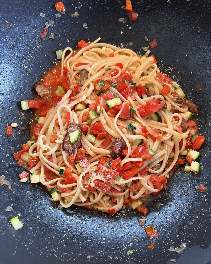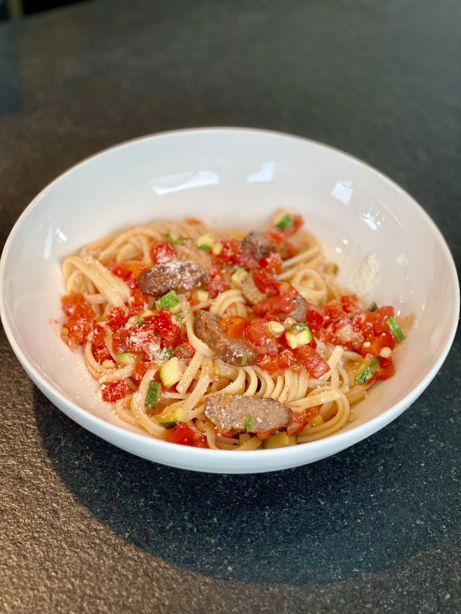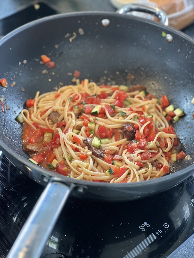 Hier habe ich ein einfaches aber total leckeres Gericht für euch. Ich habe Zucchini im Garten, so wie wundervolle Tomaten. Also habe ich mir ein wohlschmeckendes Gericht daraus kredenzt. Es sind ja oft die einfachen Dinge, die uns faszinieren. Ich hatte ein Foto davon auf den sozialen Medien gepostet und wurde darauf hin mehrmals um das Rezept gebeten. Also hier kommt es: